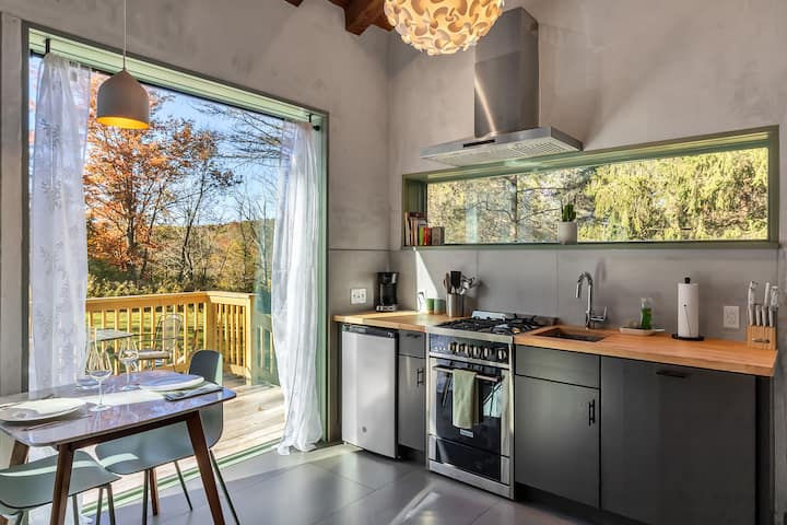 This private space is quietly tucked away in a stand of pines in the woods alongside Bryant Hill Creek. A wall of windows brings nature and natural light pouring into the space, and a fully-equipped kitchen and European bathroom provide modern comfort. Less than 4 miles outside of Ellicottville, it comfortably sleeps 2 adults and offers a chic and romantic setting for a couple to hide away with easy access to downtown. 4x4 a must in the snow, or simply park at the foot of the driveway. Tv & wifi.